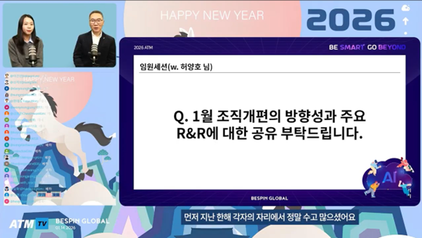 베스핀글로벌은 디지털 전환(DX)을 선도하는 기업답게 소통 방식 또한 유연합니다. 지난 2019년 코로나19 팬데믹 이후, 베스핀글로벌은 ATM 운영 방식을 발 빠르게 전환하여 현재는 YouTube Live를 활용한 온라인 방식으로 진행하고 있습니다.