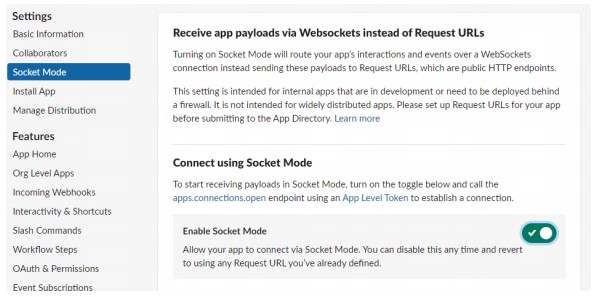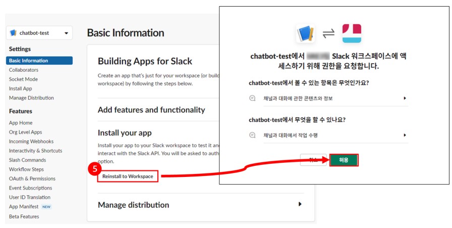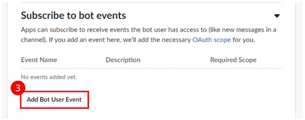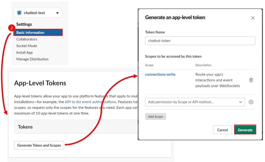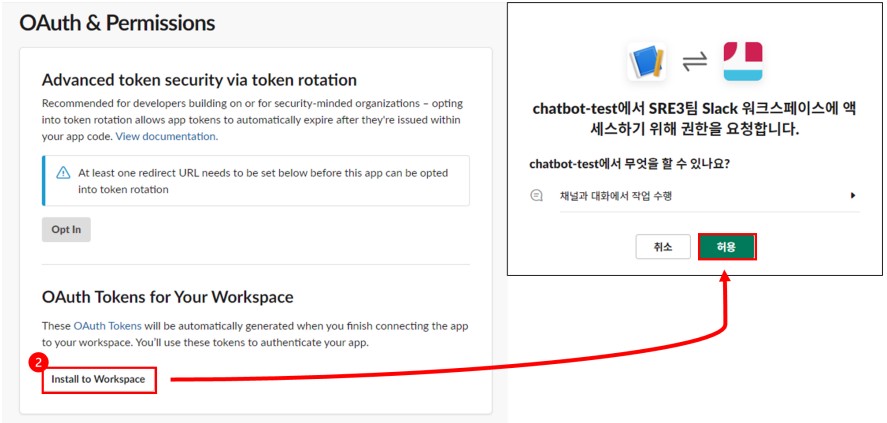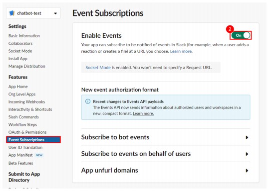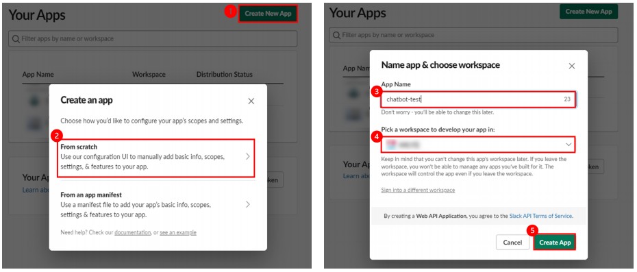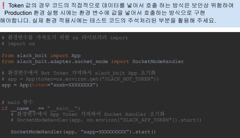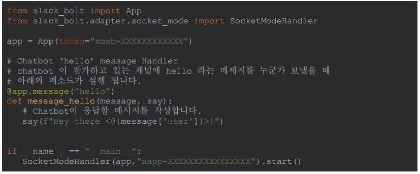 BlogTechTODAY'S PICKS Slack Bolt를 활용한 Python Chatbot 가이드 TECH by Sangmi Park 2023년 11월 15일 2023년 11월 15일 306 Slack Bolt 란? Bolt는 Slack 고유의 SDK로서 여러 최신 API들을 담고 있는 라이브러리를 제공합니다.왜 Slack bolt를 사용하는지?Slack bolt는 기존에 사용하던 slack_sdk를 기반으로 만들어진 SDK로 slack_sdk의 기능을 모두 사용할 수 있고, 기존에 코드로 구현하기 복잡했던event 트래깅 혹은 websocket mode들을 간단하게 구현 할 수 있다는 장점이 있습니다. 또한 Slack에서 직접 개발 업데이트를 제공해주어 신규 API에 대한 빠른 대응을 준비할 수 있습니다. 1. Slack App 생성 Slack Bolt를 활용하여 Python Chatbot을 개발하기에 앞서 Slack에 메세지를 보내거나 읽어오는 역할을 수행할 Slack App을 생성해야 합니다. 1-1. Slack Workspace 로그인 Chatbot을 연동하려고 하는 Slack WorkSpace에 로그인 한 후 Slack API 페이지로 이동합니다.https://api.slack.com/apps/ 1-2. Slack App 생성 Slack Api 페이지에서 신규 Slack App을 생성합니다.‘Create New App’을 클릭Create an app 팝업이 뜨면 ‘From scratch’ 선택App Name에 chatbot으로 사용할 App명을 지정Chatbot을 활용하려고 하는 Workspace를 선택Create App을 클릭하여 신규 Slack App을 생성 1-3. App/Bot Token 생성 Python에서 신규 생성한 Bot을 사용하기 위해서는 인가된 접근임을 증명할 Token이 필요합니다.Token은 신규 생성한 Bot Page에서 생성 할 수 있습니다. Token을 신규 생성한 후 유출되지 않도록 주의 해야합니다. 1-3-1. App Token 생성 Slack API 페이지에서 신규 생성한 App을 선택합니다. Setting > Basic Information > App-Level-Tokens 에서 App Token을 생성합니다.생성하려는 App Token의 Scope는 ‘connections:write’를 선택합니다. 3. 생성된 Token을 안전한 곳에 저장합니다. 1-3-2. Bot Token 생성 Features > OAuth & Permissions > Scopes > Bot Token Scopes에서 ‘chat:write’ 권한을 추가해 줍니다. 추가한 Scopes를 Workspace에 적용시키려면 Install이 필요합니다.Features > OAuth & Permissions > OAuth Tokens for Your Workspace 에서 ‘Install to Workspace’ 버튼을 클릭, 권한을 허가 해줍니다. 권한을 허용하면 Features > OAuth & Permissions > OAuth Tokens for Your Workspace 에서 신규 생성된 Bot Token을 확인 할 수 있습니다.해당 토큰을 안전한 곳에 저장합니다. 1-4. Slack App Socket mode 활성화 Slack에서 보내는 메시지를 신규로 만든 Slack App이 실시간으로 체크해서 반응 할 수 있도록 구성하기 위해서는 여러 방법이 있지만 이 가이드에서는 SocketMode를 사용합니다.Settings > Socket Mode > Connect using Socket Mode 에서 Enable Socket Mode 버튼을 활성화 합니다. 2. Python Slack Chatbot 작성 2-1. Python 환경 구성 Python3와 pip가 설치 되어 있다는 가정하에 설명 하겠습니다.만약 설치가 되어 있지 않다면 OS 환경에 맞춰서 python3 최신버전과 그와 연동되는 pip를 설치해주세요. 2-1-1. slack_bolt SDK 설치 pip를 사용하여 slack chatbot을 구성할 서버에 slack_bolt 라이브러리를 설치하여 줍니다.(문서작성 기준 최신버전 사용 slack_bolt v1.18.0) 2-1-2. Chatbot python 파일 작성 app.py 파일을 생성합니다.아래의 테스트 코드를 작성합니다.SLACK_BOT_TOKEN 과 SLACK_APP_TOKEN 에 위에서 저장했던 Token 값을 넣어줍니다. 3. python3 로 app.py를 실행합니다. 4. Bolt App이 실행되고 있다는 문구가 뜨면 성공적으로 연동 된 것 입니다. 3. Slack Chatbot 테스트 이제 생성한 Slack App과 Python Chatbot을 활용하여 여러 Event를 처리할 수 있습니다.Slack API에는 많은 Event들이 존재하는데, 다양한 Event에 대한 정보는 Slack 공식 Document를 참고하여 주세요. https://api.slack.com/apis/connections/events-api 3-1. Chatbot Event Subscriptions 등록 Slack App에서 Event에 대한 정보를 Python Chatbot으로 Route 하기 위해서는, 어떤 Event를 Route 할 것인지에 대한 설정이 필요합니다.Slack에서 Event에 대한 구독을 등록함으로써 Python으로 작성한 Chatbot에 Event가 Route 되게 됩니다.Slack API 페이지에서 생성한 Slack App을 선택합니다. 2. Features > Event Subscriptions 에서 Enable Event를 활성화 합니다. 3. Subscribe to bot events에 Add Bot User Event를 선택하여 아래의 event들을 구독합니다. message.channels : 해당 App 이 추가된 public channel의 메시지를 Listen 합니다.message.groups : 해당 App 이 추가된 private channel의 메시지를 Listen 합니다.message.im : 해당 App 이 추가된 DM의 메시지를 Listen 합니다.message.mpim : 해당 App 이 추가된 Multi-person DM의 메시지를 Listen 합니다.4. 변경사항 저장을 위해 Save Change를 클릭합니다. 변경한 내용을 WorkSpace에 반영하기 위해서 Basic Information > Building Apps for Slack > Install your app 에서‘Reinstall to Workspace’를 클릭해 Reinstall 작업을 진행합니다. 3-2. Python Chatbot Event Handler 작성 Event 구독을 완료 하였기 때문에 이제 Python으로 작성한 Chatbot의 Websocket을 실행 시키게되면 Event 발생 시 지정한 Handler가 호출 되게 됩니다. Chatbot을 활용할 채널에 추가하고 메시지를 보내 작성한 Chatbot이 동작하도록 코드를 작성하겠습니다. 3-2-1. Message Event Route Handler Message Event는 Chatbot이 속한 Channel에서 누군가 메시지를 보냈을 때 발생하는 이벤트 입니다.테스트에서는 해당 이벤트를 Route하여 Chatbot이 응답하는 처리를 진행해 보겠습니다. Slack App을 만든 Workspace에서 임의의 채널에 Chatbot App을 초대 합니다. 2. Python Chatbot Co