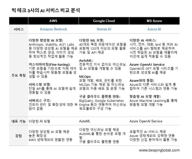 빅 테크 3사의 ‘AI 서비스’ 심층 비교! 나의 선택은? BESPICK by Sangmi Park 2024년 10월 22일 지난 베스픽에서 오픈AI의 o1에 대해서 이야기했는데요. o1의 등장으로 오픈AI가 본격적으로 기업을 타깃으로 한 B2B 비즈니스에 돌입했다고 보여집니다. 그래서 이번엔 오픈AI 외에 기업의 AI 도입을 도와주는 다른 솔루션들에 대해서 알아보고자 합니다. ‘AI 플랫폼 소프트웨어’란 기업들이 자체적으로 AI 모델을 개발하고 배포할 수 있도록 돕는 다양한 도구와 서비스를 제공하는 도구를 말합니다. 2023년 기준 $27.9 billion(약 38조 원)인 AI 플랫폼 소프트웨어 시장은 매년 40.6%씩 가파르게 성장해 2028년에는 무려 $153 billion(약 209조 원) 규모에 달할 것이라고 전망되고 있습니다. AI 전반을 아우르기 때문에 플랫폼의 종류는 △머신러닝 플랫폼 △딥러닝 프레임워크 △자연어처리(NLP) 솔루션 △컴퓨터 비전 솔루션 △MLOps 플랫폼 △AI 데이터 플랫폼 △AI 시뮬레이션 플랫폼까지 매우 다양합니다.대부분의 AI 플랫폼이 클라우드 기반으로 제공되고 있다는 것은 잘 아실 텐데요. 클라우드 전문 기업 베스핀글로벌이 빠르게 AI MSP 서비스를 출시할 수 있었던 것도 이러한 배경 때문입니다. 이젠 AI 매니지드 전문 기업으로 변모한 베스핀글로벌이 정리한 ‘AWS, 구글, 마이크로소프트의 AI 서비스 비교 표’는 글의 마지막 부분에서 보실 수 있습니다. Google Cloud : Vertex AI Vertex AI는 Google Cloud의 대표적인 통합 AI 플랫폼으로, 데이터 과학자와 머신러닝 엔지니어가 AI 모델을 보다 빠르게 개발, 배포, 확장할 수 있게 지원해 줍니다. Vertex AI를 사용하면 머신러닝 모델 학습, 평가, 배포 등을 한곳에서 수행할 수 있죠. 40개 이상의 독점 파운데이션 모델을 포함해 120개 이상의 모델을 활용할 수 있고, API로 사용도 가능합니다.사전 학습된 AI 모델을 기반으로 머신러닝 지식이 부족한 사용자도 손쉽게 활용할 수 있습니다. 또 다른 강력한 장점은 구글 클라우드 기능과의 긴밀한 연결성입니다. BigQuery(빅쿼리), Google Kubernetes Engine(GKE) 등 구글 클라우드의 대표적인 기능과 연동하여 머신러닝 워크플로우를 구성할 수 있어 편리합니다.Vertex AI의 여러 기능 중 AutoML 기능을 살펴보겠습니다. AutoML은 머신러닝 지식이 부족한 사용자도 쉽게 고품질의 AI 모델을 개발할 수 있도록 도와주는 기능인데요. 데이터를 업로드하고 몇 가지 설정만 하면 자동으로 최적의 모델을 학습시키고 성능을 평가하여 추천해 줍니다. 또한 구글의 멀티 모달 생성형 AI인 Gemini를 활용해 텍스트, 이미지, 영상, 코드 등 다양한 타입의 정보를 결합하고 생성할 수도 있습니다. 때문에, AutoML을 사용하면 데이터 전문가뿐 아니라 코드를 모르는 일반 사용자도 AI 모델을 쉽고 빠르게 활용할 수 있습니다. MS Azure : Azure AI 마이크로소프트는 자사의 다양한 AI 기능을 통합한 서비스로 Azure AI를 선보였는데요. 역시 기업이 AI를 보다 쉽게 빠르게 도입하는 것을 지원하는 것을 목적으로 합니다. Azure AI 서비스의 주요 항목으로는 △Azure OpenAI Service △Azure AI Search △Azure AI Content Safety △Azure AI Document Intelligence △Azure AI Voice △Azure AI Language △Azure AI Translator △Azure AI Vision 등이 있는데요.그 중 Azure OpenAI Service는 OpenAI와 Meta 등 다양한 모델을 사용해 생성형AI 환경을 개발하는 것인데요. GPT 시리즈를 기반으로 고급 자연어처리(NLP) 작업을 지원합니다. Q&A 시스템, 대화형 AI 챗봇, 코드 생성 및 분석, AI 기반 콘텐츠 생성 등 다양한 작업이 가능한데요. 이를 활용해 고객 서비스 자동화나 데이터 분석, 마케팅 콘텐츠 제작, 코딩 및 소프트웨어 개발 등의 AI 애플리케이션을 개발할 수 있습니다.Azure AI의 가장 큰 장점은 Microsoft Azure 클라우드 인프라와 Open AI, Copilot 등 마이크로소프트 생태계의 AI 요소들과 상호 보완 및 확장이 가능하다는 것을 꼽을 수 있겠네요. AWS : Amazon Bedrock AWS의 AI 서비스라면 오랜기간 개발자들의 사랑을 받아온 머신러닝 플랫폼 Amazon SageMaker가 있지요. 아마존 세이지메이커는 머신러닝 모델을 손쉽게 구축 및 학습, 배포, 관리할 수 있는 통합 개발 환경을 제공합니다.하지만 최근 주목받는 AWS의 AI 서비스는 따로 있죠. 바로 생성형 AI 서비스 Amazon Bedrock입니다. 아마존 베드락은 AI21 Labs, Anthropic, Cohere, Meta, Mistral AI, Stability AI 및 Amazon과 같은 여러 고성능 AI 파운데이션 모델을 활용해 생성형AI 애플리케이션을 구축할 수 있게 지원하는 서비스입니다. 이 플랫폼을 사용하면 단일 API를 통해 복잡한 AI 모델을 쉽게 불러오고 애플리케이션에 적용할 수 있어 편리합니다.또한 서버리스 구조로 제공되기 때문에 인프라 관리나 확장성 문제에서도 자유로울 수 있습니다. 아마존 베드락의 가장 큰 장점은 역시 여러 파트너사의 다양한 생성형 AI 모델을 제공한다는 것일 텐데요. 선택의 폭이 넓다 보니 개발 목표에 가장 적합한 모델을 선택해 최적의 성능을 발휘할 수 있으니까요.AWS, Google, MS Azure의 AI 서비스들의 장단점과 우리 기업에는 어떤 서비스가 적합할지 많이 고민되시지요? 그리고, 어떤 LLM이 우리 서비스에 가장 효과적일지도 궁금하실 테고요. 자, 그럼 앞서 소개한 3사의 AI 서비스를 표 한 장