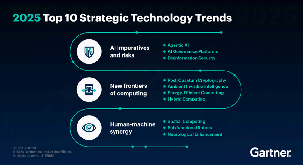 2025년엔 어떤 기술이 대세? 가트너와 IDC 예측 한눈에 보기🔍 BESPICK by Sangmi Park 2024년 12월 17일 안녕하세요, 구독자 여러분. 벌써 2024년을 마무리할 시점에 다다랐는데요 다가오는 2025년에는 또 어떤 변화가 기다리고 있을까요? 최근 로이터의 보도에 따르면 내년 AI Agenda 중 가장 주요한 이슈로 다뤄지고 있는 것이 바로 ‘자율 에이전트’와 ‘수익성’입니다. 가트너와 IDC 역시, 이를 놓치지 않았는데요. 중요하게 생각하는 요소는 비슷하나, 접근 방식은 조금 다릅니다. 오늘의 베스픽은 올해의 IT 하이라이트 소식들을 정리하고, 가트너와 IDC가 예측한 2025년의 테크 트렌드를 비교 분석해볼까 합니다. 빅테크로 보는 2024년 AI 이슈 총정리📝 OpenAI는 향상된 버전의 GPT 시리즈를 일년 내내 연이어 선보이며 서비스 다각화에 나섰는데요. GPT-4o, GPT-4o Mini, o1, ChatGPT Pro, Sora, Canvas까지 다양하게 출시하며 멀티모달 기능부터 복잡한 추론 모델, 전문가 상품, 동영상 생성 특화 모델, 협업 인터페이스 기능에 이르기까지 생성형 AI 상용화를 위한 행보를 펼쳤습니다. 그 결과 챗GPT 주간 활성 사용자 수는 전년 대비 두 배 이상 증가하며 2억 명을 돌파했고요. 포춘 500대 기업의 92%가 OpenAI를 활용하는 것으로 나타났고, API 사용량도 두 배 이상 증가하며 기업의 필수 툴로 자리매김했습니다. 그리고 OpenAI와 마이크로소프트의 긴밀한 협력의 결과물 코파일럿(Copilot)도 빼놓을 수 없죠. 지난 5월엔 AI 작업에 특화된 하드웨어인 Copilot+PC가 출시되었고, 11월엔 Copilot 대규모 업그레이드 예정 사항들이 발표되었습니다. 반복 문서 작업을 자동화 할 수 있는 기능, 콘텐츠 분석 기능, 문서 기반 PPT 생성 기능 등 사무 업무 효율성을 크게 높여주는 기능들로 이루어졌습니다.2024년 구글의 가장 큰 뉴스는 역시 멀티모달 LLM 제미나이(Gemini)의 출시입니다. Gemini가 출시되며 구글의 AI 생태계는 Gemini를 중심으로 더욱 강력해졌는데요. 기존에 출시된 Duet AI, Vertex AI, Bard, PaLM 등 구글의 다양한 AI 모델들이 단계적으로 제미나이에 통합되고 있습니다. 구글 워크스페이스에도 Gemini가 탑재되며 Gmail, Docs, Sheets, Slide 등에서 쉽게 생성형AI를 사용할 수 있게 되었습니다. 업무 생산성과 사용자 경험이 혁신적으로 높아진 것이죠.AWS도 조금 늦은감이 있지만, 2024 리인벤트에서 아마존 생성형 AI 파운데이션 모델 노바(Nova) 출시를 공표하며 본격적으로 빅테크의 생성형 AI 모델 대전에 나섰습니다. 경쟁사보다 더 빠른 처리 속도와 낮은 가격을 내세우며 호기롭게 시장에 도전장을 던진 것인데요. AWS의 클라우드 환경에서 AI와 ML을 개발하려는 기업들에게 반가운 소식이 되었습니다. Statista의 조사 결과에 따르면 2024년 3분기 기준 AWS는 31%의 점유율로 여전히 글로벌 클라우드 시장 1위를 차지하고 있는데요. AWS의 생태계 확장이 향후 시장에 어떻게 작용할지 궁금해 집니다.이 외에도 IBM은 기업용 AI 파운데이션 모델 ‘그래니트 3.0(Granite 3.0)’을 출시하며 생성형 AI 경쟁력을 높였고, 오라클은 AI 도입 확대에 따른 오라클 클라우드(OCI) 수요 증가로 주가가 전년 대비 약 69% 상승하며 시장의 기대를 모았습니다. 가트너의 2025 예측: 기술 진화와 협업의 미래🌟 그럼 지금부터 2025년 예측 정리를 시작해보겠습니다. 가트너는 “2025 Top 10 Strategic Technology Trends”이라는 타이틀로 ▲AI imperatives and risk(AI 필수 요소와 위험 관리) ▲New frontiers of computing(컴퓨팅의 새로운 지평) ▲Human-machine synergy(인간과 기계의 시너지), 이렇게 3가지 카테고리로 나누어 10가지 트렌드를 분석했습니다. ① AI 필수 요소와 위험 관리 측면에서 가장 주목해야 할 3가지는 에이전틱 AI(Agentic AI), AI 거버넌스 플랫폼(AI Governance Platform), 가짜 정보 보안(Disinformation Security)입니다. 에이전틱 AI는 인간의 지시 없이 상황을 이해하고 실행할 수 있는 AI 시스템을 의미하고요. AI 거버넌스 플랫폼은 AI의 윤리적, 법적, 기술적 책임을 관리하는 플랫폼이라고 할 수 있습니다. 그리고 가짜 정보 보안은 조작된 콘텐츠를 탐지하고 방어하기 위한 보안 기술인데요. 즉 AI가 단순한 보조의 역할을 넘어서 자율적이면서 실질적인 의사 결정이 가능한 방향으로 진화하며, 이를 뒷받침하는 AI 거버넌스와 보안이 필수 요소로 부각될 것이라고 전망했다고 볼 수 있죠.② 컴퓨팅의 새로운 지평에는 차세대 컴퓨팅 파워의 진화에 대한 내용이 담겼는데요. 포스트 양자 암호화(Post-quantum cryptography, PQC), 에너지 효율적 컴퓨팅(Energy-efficient computing), 하이브리드 컴퓨팅(Hybrid computing), 주변 비가시성 인텔리전스(Ambient invisible intelligence)가 속합니다. 다소 어렵고 복잡해보이는 기술적 개념들이지만 그 핵심은 바로 보안 강화와 지속가능성 그리고 사용자 경험의 혁신입니다. 양자 컴퓨터의 등장으로 기존 암호화 방식 대신 새로운 보안 기술인 ‘PQC’가 필수가 되었고, 에너지 소비를 줄이면서 성능을 최적화하려는 움직임(에너지 효율적 컴퓨팅, 하이브리드 컴퓨팅)이 나타나고 있는 것이죠. 이에 더해 기존의 컴퓨팅 방식에서 벗어나 AI가 사람이 인지하지 못할 정도로 다양한 작업을 처리하게 되면서 사용자 경험의 질이 크게 향상될 것