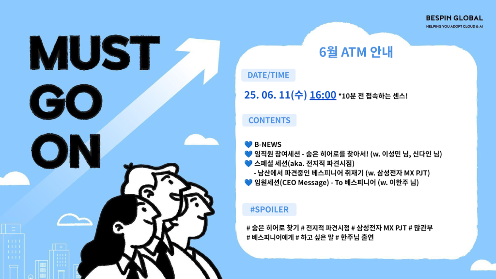 투명한 소통이 만드는 혁신의 동력, 베스핀글로벌의 ‘ATM(All Together Meeting)’을 소개합니다 INSIDE by Miyeon. Jo 2026년 02월 19일 조직의 규모가 커지고 비즈니스가 글로벌로 확장될수록, 모든 구성원이 하나의 목표를 바라보고 나아가는 ‘얼라인먼트(Alignment)’의 중요성은 더욱 커집니다. AI & 클라우드 시장의 최전선에서 빠르게 변화를 선도하는 베스핀글로벌에는 이를 가능케 하는 특별한 소통 창구가 있습니다.바로 매월 진행되는 전사 소통 행사인 ATM(All Together Meeting)입니다. 베스핀글로벌의 투명한 경영 철학과 역동적인 조직 문화를 상징하는 ATM의 현장과 그 의미를 자세히 전해드립니다. ATM이란 무엇인가요? : "모두가 함께할 때 혁신은 시작된다" ATM(All Together Meeting)은 이름 그대로 베스핀글로벌의 모든 임직원이 한자리에 모여 회사의 경영 현황, 주요 비즈니스 이슈, 그리고 우리가 나아가야 할 방향성을 실시간으로 공유하고 논의하는 자리입니다.베스핀글로벌은 ‘정보의 비대칭이 조직의 속도를 늦춘다’고 믿습니다. 따라서 ATM은 단순히 정보를 전달하는 일방향적인 공지 시간이 아니라, 경영진과 실무자가 직접 대화하며 회사의 비전을 동기화하는 ‘살아있는 소통의 장’으로 운영되고 있습니다. 시공간의 제약을 허무는 '하이브리드 소통' 베스핀글로벌은 디지털 전환(DX)을 선도하는 기업답게 소통 방식 또한 유연합니다. 지난 2019년 코로나19 팬데믹 이후, 베스핀글로벌은 ATM 운영 방식을 발 빠르게 전환하여 현재는 YouTube Live를 활용한 온라인 방식으로 진행하고 있습니다.언제 어디서나 참여 가능: 외근 중인 영업대표, 고객사에 상주 중인 엔지니어, 재택근무 중인 개발자까지. 장소에 상관없이 실시간 스트리밍을 통해 ATM에 참여합니다.쌍방향 인터랙션 구현: 실시간 채팅창을 통해 궁금한 점을 즉각 질문하고 응답받는 Q&A 세션을 운영하여, 물리적 거리와 상관없이 긴밀한 소통을 유지합니다. ATM이 다루는 핵심 콘텐츠: "숫자부터 문화까지" 매월 다양한 콘텐츠로 구성되는 ATM은 임직원들이 회사에 대해 가장 궁금해하는 내용들을 투명하게 공개합니다.① 경영진 메시지 및 경영 현황 공유회사의 매출 지표, 신규 수주 현황, 주요 사업 전략 등 경영 지표를 가감 없이 공유합니다. 이는 모든 임직원이 자신이 수행하는 업무가 회사의 전체 성과에 어떻게 기여하고 있는지 명확히 이해하도록 돕는 역할을 합니다.② 주요 프로젝트 및 성공 사례(Success Story) 발표글로벌 시장의 AI 프로젝트 성공 사례나 기술적 난관을 극복한 사례 등을 담당자가 직접 발표합니다. ‘배움-실행-공유(Learn-Do-Share)’라는 핵심 가치에 발맞춰, 한 팀의 성공이 전사의 자산이 될 수 있도록 인사이트를 나눕니다.③ 신규 입사자 소개 및 축하의 시간베스핀글로벌의 새로운 가족이 된 구성원들을 환영하고, 장기 근속자나 성과 우수자를 축하하는 세션을 가집니다. 성장을 함께 기뻐하는 문화를 통해 구성원 간의 유대감을 강화합니다. 왜 ATM인가? : 투명성이 만드는 강력한 신뢰 베스핀글로벌이 매월 많은 리소스를 투입해 ATM을 고집하는 이유는 분명합니다. 바로 ‘투명한 소통을 통한 신뢰 구축’입니다.빠르고 정확한 정보 전달: 불필요한 추측이나 오해를 방지하고, 회사의 공식적인 입장을 전 직원에게 동시에 전달함으로써 조직의 민첩성을 높입니다.심리적 안전감 확보: 회사가 나아가는 방향을 명확히 인지할 때, 임직원들은 자신의 업무에 집중하며 도전적인 목표를 설정할 수 있습니다.수평적 문화의 정착: 직급과 직책에 상관없이 누구나 의견을 제시할 수 있는 ATM의 분위기는 베스핀글로벌 특유의 유연하고 수평적인 문화를 만드는 근간이 됩니다. 마치며: 내일의 혁신을 준비하는 베스핀의 약속 ATM은 단순한 월례 회의 그 이상입니다. 이는 베스핀글로벌이 지향하는 ‘열린 조직’을 실천하는 가장 상징적인 행위입니다. 급변하는 AI와 클라우드 시장 속에서 베스핀글로벌이 흔들림 없이 전진할 수 있는 비결은, 바로 매달 ATM을 통해 확인하는 ‘우리는 연결되어 있다’는 믿음 덕분입니다.앞으로도 베스핀글로벌은 투명한 소통과 끊임없는 혁신을 통해 구성원과 회사가 함께 성장하는 미래를 만들어가겠습니다. 이밖에 IT 업계 관련 트렌드•이슈가 궁금하다면?베스핀글로벌의 뉴스레터 ‘베스픽’을 구독하고, 매주 화요일 AI&클라우드 인사이트를 가장 빠르게 받아보세요. 베스핀글로벌 문의하기 뉴스레터 구독하기 더 읽어볼 만한 컨텐츠 “이제는 기술보다 활용이다” – 2026 빅테크 M&A가 보여주는 AI 실전 전략 AI 시대의 IT 운영 전략, 2026년에는 무엇이 달라질까? 비용 절감을 넘어 ‘예측’으로, 2026 핀옵스(FinOps)가 마주한 AI 변수 2026년 02월 19일