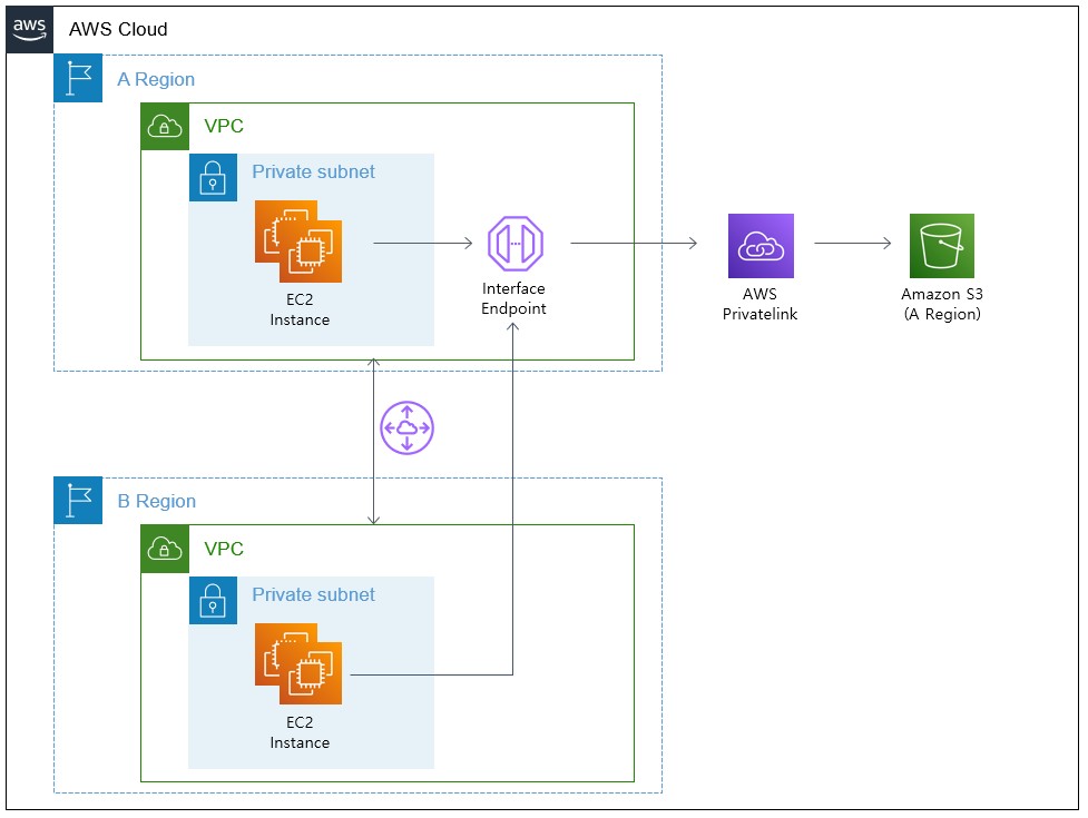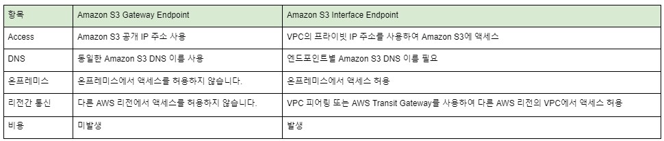 AWS VPC S3 endpoint gateway vs interface 차이 TECH by Sangmi Park 2022년 06월 28일 1. AWS VPC endpoint 란? VPC 엔드포인트를 통해 인터넷 게이트웨이, NAT 디바이스, VPN 연결 또는 AWS Direct Connect 연결이 필요 없이 Virtual Private Cloud(VPC)와 지원 서비스 간에 연결을 설정할 수 있습니다. 따라서 VPC에서 연결할 수 있는 특정 API 엔드포인트, 사이트 및 서비스를 제어합니다. 2. S3 에서 지원 가능한 VPC endpoint 유형 Gateway endpoint 와 Interface endpoint 라는 두 가지 유형의 VPC 엔드포인트를 사용하여 Amazon S3에 접근할 수 있습니다. Gateway endpoint 는 AWS 네트워크를 통해 VPC에서 Amazon S3에 접근하기 위해 route table 에 지정하는 Gateway 입니다. Interface endpoint 는 Private IP 주소를 사용하여 VPC 피어링 또는 AWS Transit Gateway를 사용하여 VPC 내, 온프레미스 또는 다른 AWS 리전의 VPC에서 Amazon S3로 요청을 라우팅함으로써 게이트웨이 엔드포인트의 기능 확장할 수 있습니다. 2.1 interface vs gateway 차이 ※ Interface Endpoint 사용 시 PirvateLink 에 대한 요금이 발생합니다. https://aws.amazon.com/ko/privatelink/pricing/#Interface_Endpoint_pricing 2.2 Gateway Endpoint Gateway Endpoint 는 S3 리전별로 지정된 IP 접두사 목록을 기반으로 라우팅 테이블의 경로 대상에 적용하여 사용합니다. Gateway Endpoint 속성 및 제한엔드포인트에는 Amazon S3 리소스에 액세스하기 위한 엔드포인트 사용을 제어하는 정책이 있습니다. 기본 정책은 VPC 내의 모든 사용자 또는 서비스가 자격 증명을 사용하여 아무 AWS 계정에서 아무 Amazon S3 리소스에 액세스할 수 있도록 허용합니다. VPC가 연결된 계정이 아닌 다른 AWS 계정에 대한 Amazon S3 리소스도 마찬가지입니다.Amazon S3가 수신한 해당 서브넷에 있는 인스턴스의 원본 IPv4 주소는 VPC의 퍼블릭 IPv4 주소에서 프라이빗 IPv4 주소로 변경됩니다. 엔드포인트는 네트워크 라우팅을 스위칭하고 열린 TCP 연결을 끊습니다. 퍼블릭 IPv4 주소를 사용한 이전 연결이 다시 시작되지 않습니다. 따라서 엔드포인트를 만들거나 수정할 때는 중요한 작업을 실행하지 않는 것이 좋으며 연결이 끊어진 후에는 소프트웨어가 자동으로 Amazon S3에 다시 연결할 수 있는지 테스트해야 합니다.IAM 정책 또는 버킷 정책을 사용하여 VPC IPv4 CIDR 범위(프라이빗 IPv4 주소 범위)로부터의 액세스를 허용할 수 없습니다. VPC CIDR 블록이 중첩되거나 동일할 수 있고 이로 인해 예기치 않은 결과가 발생할 수 있습니다. 따라서 VPC 엔드포인트를 통해 Amazon S3에 요청할 때는 IAM 정책에 aws:SourceIp 조건을 사용할 수 없습니다. 사용자 및 역할의 IAM 정책과 모든 버킷 정책에도 같은 사항이 적용됩니다. 문에 aws:SourceIp 조건이 포함되어 있는 경우, 값이 제공된 IP 주소 또는 범위와 일치하지 않습니다. 대신에 다음 작업을 할 수 있습니다.라우팅 테이블을 사용하여 엔드포인트를 통해 Amazon S3의 리소스에 액세스할 수 있는 인스턴스를 제어할 수 있습니다.버킷 정책의 경우 특정 엔드포인트 또는 특정 VPC에 대한 액세스를 제한할 수 있습니다.엔드포인트는 교차 리전 요청을 지원하지 않습니다. 엔드포인트는 현재 IPv4 트래픽에 대해서만 지원됩니다. 2.3 Interface Endpoint Interface Endpoint 는 서브넷의 IP 주소 범위에서 프라이빗 IP 주소를 사용하는 탄력적 네트워크 인터페이스이며, AWS가 소유하거나 AWS 고객 또는 파트너가 소유한 서비스로 전달되는 트래픽에 대한 진입점 역할을 합니다.Interface Endpoint 속성 및 제한각 인터페이스 엔드포인트에서 가용 영역당 1개의 서브넷만 선택할 수 있습니다.인터페이스 엔드포인트를 생성할 때 계정에 매핑된 가용 영역에 엔드포인트가 생성됩니다. 이 가용 영역은 다른 계정과는 별도입니다.서비스 공급자와 소비자의 계정이 서로 다르며 여러 가용 영역을 사용하고 소비자가 VPC 엔드포인트 서비스 정보를 보는 경우 응답에는 공통 가용 영역만 포함됩니다. 예를 들어 서비스 공급자 계정에서 us-east-1a 및 us-east-1c를 사용하고 소비자가 us-east-1a 및 us-east-1b를 사용하는 경우 응답에는 공통 가용 영역 us-east-1a의 VPC 엔드포인트 서비스가 포함됩니다.기본적으로 각 인터페이스 엔드포인트는 가용 영역당 최대 10Gbps의 대역폭을 지원하고 최대 40Gbps까지 자동으로 조정되며, 변경을 위해 AWS Support 를 서브넷에 대한 네트워크 ACL이 트래픽을 제한하는 경우 엔드포인트 네트워크 인터페이스를 통해 트래픽을 보내지 못할 수 있습니다. 서브넷의 CIDR 블록에서 주고 받는 트래픽을 허용하는 적절한 규칙을 추가해야 합니다.엔드포인트 네트워크 인터페이스와 연결된 보안 그룹이 서비스와 통신하는 VPC의 리소스와 엔드포인트 네트워크 인터페이스 간의 통신을 허용하는지 확인합니다. AWS CLI 같은 명령줄 도구가 HTTPS를 통해 VPC의 리소스에서 AWS 서비스로 요청하려면 보안 그룹에서 인바운드 HTTPS(포트 443) 트래픽을 허용해야 합니다.인터페이스 엔드포인트는 TCP 트래픽만을 지원합니다.엔드포인트를 만들 경우, 연결하려는 서비스에 대한 액세스를 제어하는 엔드포인트에 엔드포인트 정책을 연결할 수 있습니다.참가자는 자신이 소유하지 않은 VPC에서 Amazon Route53 Resolver 엔드포인트를 생성할 수 없습니다. VPC 소유자만 인바운드 
