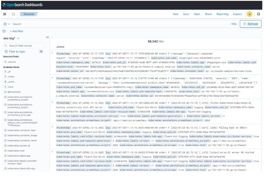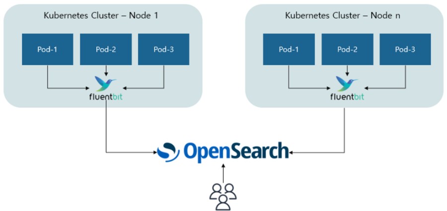 EKS + Fluent bit + OpenSearch 구성을 통한 로그 수집 TECH by Sangmi Park 2024년 02월 08일 1-a. EFK (ElasticSearch + Fluented + Kibana)란? EFK란 ElasitcSearch + Fluentd bit + Kibana의 조합을 일컬음보통 지속적으로 유입되는 로그 데이터를 수신하고 이 데이터를 차트와 그래프로 시각화 하거나 분석할때 사용하는 솔루션2021년 9월, Elastic의 라이선스 변경으로 인해 AWS에서는 ElasticSearch에 대한 업데이트 제공을 중단함. 기존 ElasticSearch를 포크(Fork)하여 OpenSearch라는 오픈 소스 서비스를 개시하고,Elastic에서 함께 지원하던 시각화 도구인 Kibana는 OpenSearch Dashboard 라는 서비스로 지원 1-b. OpenSearch + Fluent bit + OpenSearch Dashboard Fluent bit : 데이터(로그)를 수집해서 Opensearch로 전달OpenSearch : Fluentd로부터 받은 데이터를 검색 및 집계하여 필요한 정보 획득OpenSearch Dashboard: Opensearch의 빠른 검색능력을 통해 데이터 시각화 및 모니터링 1-c. Fluentd / Fluent bit / LogStash 장단점 장점단점Fluentd– 다양한 데이터 소스에서 로그를 수집하고 대용량 데이터 처리를 지원하는 포괄적인 로그 수집기– 풍부한 플러그인과 커뮤니티 지원이 제공됨– 일부 환경에서 성능이 떨어질 수 있으며, 메모리 사용량이 크고 설정이 상대적으로 복잡함Fluent bit– 경량화 되어 자원 소모가 적고, 빠른 처리 속도 제공– 컨테이너 환경에 적합하고 메모리 효율성이 뛰어남– 로그 처리 파이프라인이 다른 컴포넌트와 비교했을 때,일부 기능이 제한적일 수 있음LogStash– 다양한 데이터 입력과 출력 플러그인 지원– ElasticSearch와의 연동이 강력하며, 데이터 처리 파이프라인 구축이 상대적으로 용이– 자원 소모가 크고, 처리량이 많은 시나리오에서성능에 제약이 있을 수 있음 2-a. 사전 준비사항 1) 로그를 생성할 애플리케이션 생성git clone https://github.com/GoogleCloudPlatform/microservices-demo.git cd microservice-demo 2) 애플리케이션 yaml 파일 클러스터에 적용kubectl apply -f ./microservice-demo/release/kubernetes-manifests.yaml 3) 배포 확인kubectl get pod -A -n logging 2-b. Elasticsearch(Amazon OpenSearch Service) 생성 https://docs.aws.amazon.com/ko_kr/opensearch-service/latest/developerguide/createupdatedomains.html 를 참고하여 Elasticsearch 생성 2-c. AWS IRSA (IAM Role for Service Account) 설정 Kubernetes Service Account와 AWS IAM 역할을 연결하여 AWS 리소스에 대한 접근 권한을 부여하는 접근제어 방식1) EKS OIDC Identity Providers 생성 IAM > Access Management > Identity Providers > Add Provider → 공급자 유형 : OpenID Connect → 공급자 URL EKS > Clusters > 클러스터 선택 > Overview > OpenID Connect provider URL → 대상 : sts.amazonaws.com 2) IAM Policy 생성 IAM > Access Management > Policies > Create policy{ "Version": "2012-10-17", "Statement": [ { "Action": [ "es:ESHttp*" ], "Resource": "${OPENSEARCH_ARN}", "Effect": "Allow" } ]}→ ${OPENSEARCH_ARN} : 생성한 OpenSearch의 ARN 정보로 교체 3) IAM Role 생성 IAM > Access Management > Policies > Create role→ 신뢰할 수 있는 엔터티 유형 : 사용자 지정 신뢰 정책{ "Version": "2012-10-17", "Statement": [ { "Effect": "Allow", "Principal": { "Federated": "${IDENTITY_PROVIDER_ARN}" }, "Action": "sts:AssumeRoleWithWebIdentity", "Condition": { "StringEquals": { "${IDENTITY_PROVIDER}:aud": "sts.amazonaws.com", "${IDENTITY_PROVIDER}:sub": "${SERVICE_ACCOUNT_NAME}", } } } ] } → ${IDENTITY_PROVIDER_ARN} : 위에서 확인한 EKS OpenID Connect provider ARN 값→ ${IDENTITY_PROVIDER}:aud : 위에서 확인한 EKS OpenID Connect provider→ ${IDENTITY_PROVIDER}:sub : 생성할 Service Account 이름 2-d. RBAC (Role-Based Access Control) 설정 Kubernetes Service Account에게 클러스터 수준의 리소스 접근을 제어할 권한 부여1) Service Account 생성apiVersion: v1 kind: ServiceAccount metadata: name: fluent-bit annotations: eks.amazonaws.com/role-arn: ${IAM_ROLE_ARN} namespace: logging 2) Cluster Role 생성apiVersion: rbac.authorization.k8s.io/v1 kind: ClusterRole metadata: name: fluent-bit-read rules: - apiGroups: - "" resources: - namespaces - pods verbs: - get - list - watch 3) Cluster Role Binding 생성apiVersion: rbac.authorization.k8s.io/v1 kind: ClusterRoleBinding metadata: name: fluent-bit-read roleRef: apiGroup: rbac.authorization.k8s.io kind: ClusterRole name: fluent-bit-read subjects: - kind: ServiceAccount name: fluent-bit namespace: logging 2-e. Fluent-bit ConfigMap 생성 apiVersion: v1 kind: ConfigMap metadata: labels: k8s-app: fluent-bit name: fluent-bit-config namespace: logging data: fluent-bit.conf: | [SERVICE] Flush 1 Log_Level info Daemon off Parsers_File parsers.conf HTTP_Server On HTTP_Listen 0.0.0.0 HTTP_Port 2020 @INCLUDE input-kubernetes.conf @INCLUDE filter-kubernetes.conf @INCLUDE output-opensearch.conf input-kubernetes.conf: | [INPUT] Name tail Tag kube.* Path /var/log/containers/*.log Parser docker DB /var/log/flb_kube.db Mem_Buf_Limit 5MB Skip_Long_Lines On Refresh_Interval 10 filter-kubernetes.conf: | [FILTER] Name kubernetes Match kube.* Kube_URL https://kubernetes.default.svc:443 Kube_CA_File /var/run/secrets/kubernetes.io/serviceaccount/ca.crt Kube_Token_File /var/run/secrets/kubernetes.io/serviceaccount/token Kube_Tag_Prefix kube.var.log.containers. Merge_Log On Merge_Log_Key log_processed K8S-Logging.Parser On K8S-Logging.Exclude On output-opensearch.conf: | [OUTPUT] Name es Match * Host ${OPENSEARCH_ENDPOINT} Port 443 TLS On AWS_Auth On AWS_Region ${AWS_REGION} Index ${INDEX_NAME} Replace_Dots On Suppress_Type_Name On parsers.conf: | [PARSER] Name docker Format json Time_Key time Time_Format %Y-%m-%dT%H:%M:%S.%L Time_Keep On→ [INPUT] Path /var/log/containers/*.log : 수집할 로그가 위치