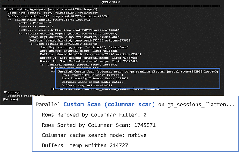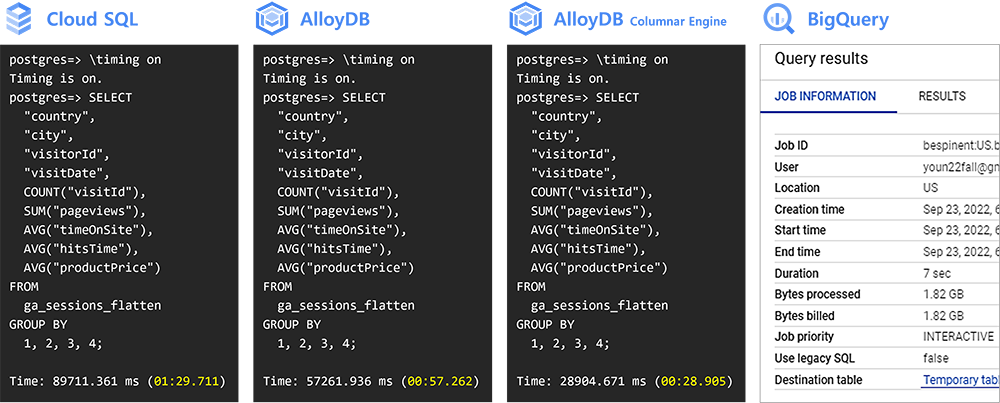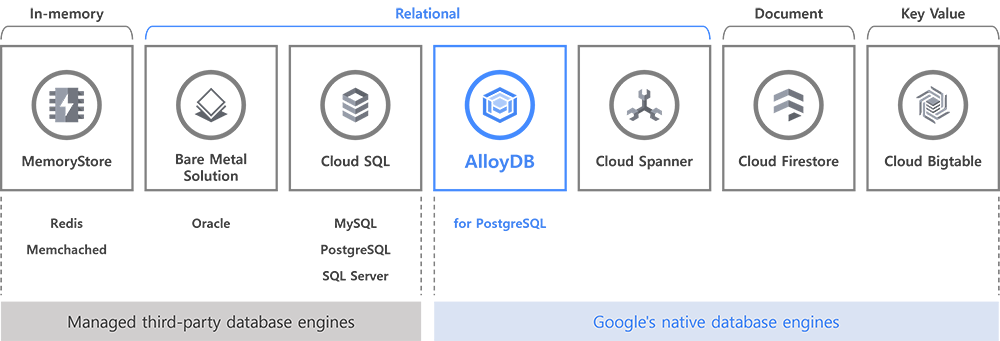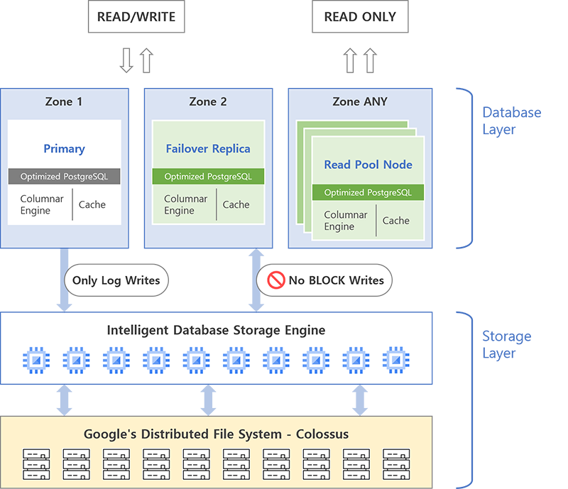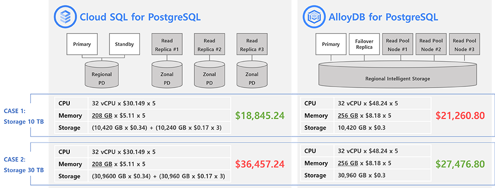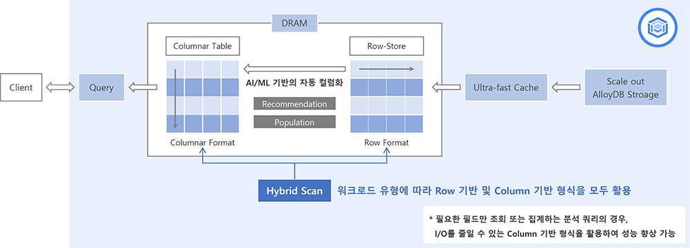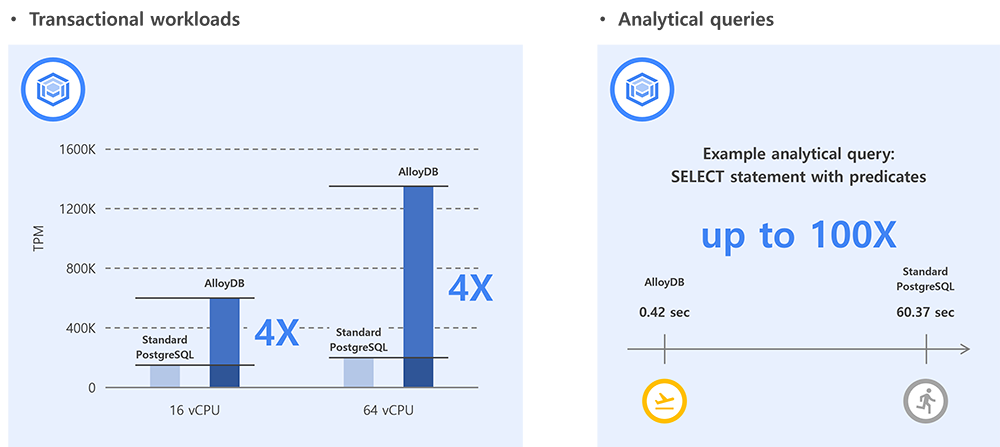구글 클라우드 인사이트 AlloyDB 쿼리 성능 비교 구글 인사이트 by Miyeon. Jo 2024년 03월 12일 2024년 03월 12일 394 구글 PS2팀 윤영훈목차AlloyDBIntelligent, database-aware storageColumnar Engine성능 비교결과 분석1. AlloyDBAlloyDB는 구글 클라우드에서 제공하는 완전히 관리형 PostgreSQL 호환 데이터베이스 서비스로 ACID – atomicity, consistency, isolation, and durability – 호환 트랜잭션을 지원합니다.AlloyDB의 성능은 아래와 같이 소개되고 있는데, 해당 성능을 구성되게 하는 AlloyDB의 특징을 설명하고, 테스트 환경을 구성하여 쿼리 실행 성능을 비교 측정합니다.트랜잭션 워크로드에서 표준 PostgreSQL보다 4배 빠른 속도.분석 워크로드에서 표준 PostgreSQL보다 최대 100배 빠른 속도.2. Intelligent, database-aware storageAlloyDB는 컴퓨팅과 스토리지를 분리하여 I/O 병목 현상을 줄이고, LPS(Log processing service)를 사용하여 많은 데이터베이스 작업을 스토리지 계층으로 오프로드합니다.LPS(Log processing service)는 WAL 레코드를 처리하고 데이터베이스 블록을 생성하는 AlloyDB의 내부 서비스입니다. 컴퓨팅 레이어는 WAL 레코드를 스토리지 계층에 전달하기만 하여 블록 쓰기는 필요하지 않습니다.3. Columnar EngineAlloyDB의 Columnar Engine 기능을 활성화하면, row 기반의 저장 데이터를 ML/AI 기반으로 column 형식 데이터로 자동으로 구성합니다. 최적의 table/column을 지능적으로 선택하고 이 데이터를 메모리에 자동으로 유지합니다. 성능 비교를 위해서 Columnar Engine을 활성화하는 경우 먼저 ‘warm-up’ 쿼리를 실행한 후 성능을 측정합니다.Columnar Engine은 데이터 스캔 결과를 구체화하지 않고, 관련된 column에서 직접 집계 작업을 수행하며, 스캔속도를 높이기 위해서 최소 및 최대 값과 같은 column별 메타데이터를 활용하여 알고리즘을 최적화합니다.Columnar Engine을 활성화된 상태라면, 쿼리의 실행 계획에서 ‘columnar scan’이라고 표시된 내용을 확인할 수 있습니다.Columnar Engine 비활성화 상태Columnar Engine 활성화 상태4. 성능 비교성능 비교를 위하여 18,608,748개의 row를 포함한 5GB 정도의 데이터를 구글 클라우드의 Cloud SQL, Alloy DB, Alloy DB + Columnar Engine, BigQuery 서비스에 동일하게 구성합니다. 각 데이터베이스에서 해당 데이터를 조회 및 집계하는, 동일한 쿼리를 실행하여 처리시간을 비교합니다.각 데이터베이스에서 동일한 쿼리를 실행한 결과는 아래와 같습니다.서비스Cloud SQLAlloy DBAlloy DB + Columnar EngineBigQuery실행시간(초)89572975. 결과 분석쿼리 성능의 비교 결과에서 처리 속도가 가장 우수한 데이터베이스는 BigQuery이지만, BigQuery는 데이터 스캔 크기에 따라 조회비용이 추가로 과금되기 때문에 조회 빈도가 높은 경우 BigQuery 비용이 과도하게 발생할 수 있음을 유의해야 합니다.또한 Cloud SQL과 AlloyDB의 비용을 비교하는 경우, 컴퓨팅 리소스 및 스토리지 조건에 따라 Cloud SQL이 비용면에서 효율적일 수 있습니다. 아래는 스토리지 용량이 클수록 Alloy DB를 선택하는 것이 비용이 절감되는 예시입니다. 출처Compare Analytical Queries Performance of AlloyDB with BigQueryAlloyDB under the hood: Replication gets closer to real-timeBenchmarking for AlloyDB and how to do itAlloyDB for PostgreSQL under the hood: Intelligent, database-aware storageConfigure the columnar engineManage column store content using auto-columnarization