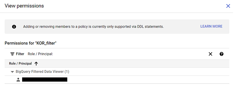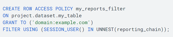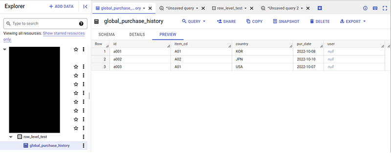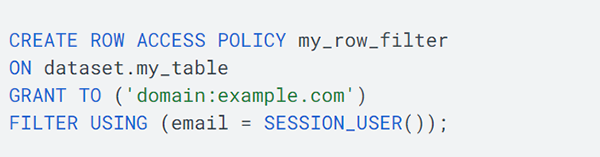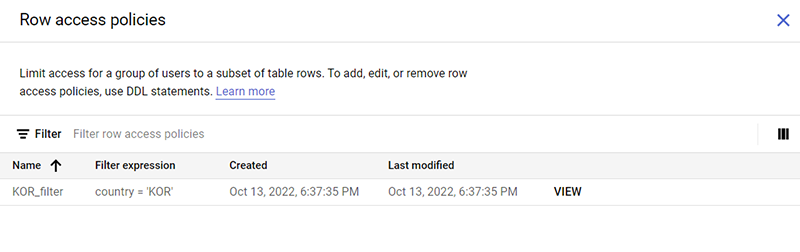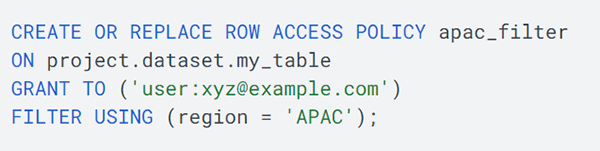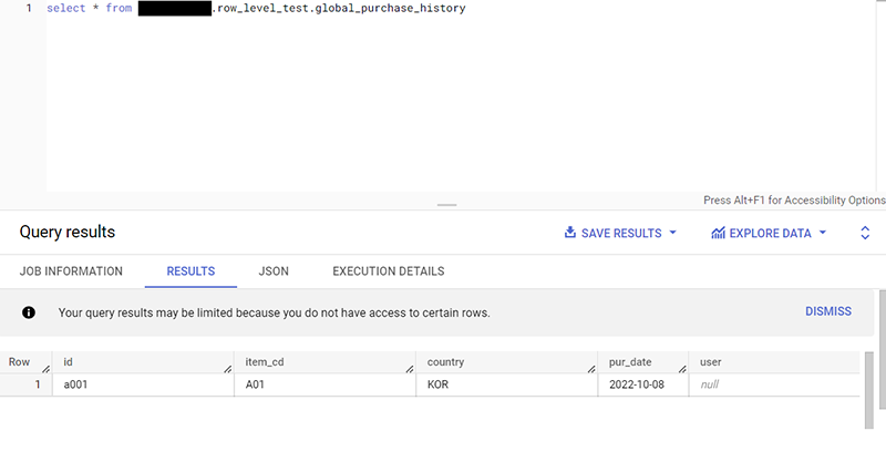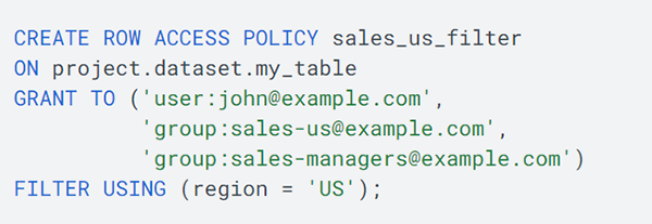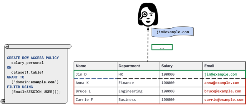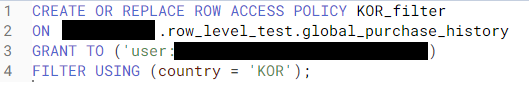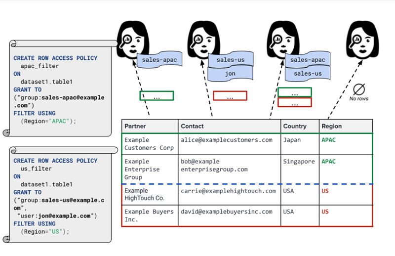 구글 클라우드 인사이트 BigQuery row-level security 구글 인사이트 by Miyeon. Jo 2022년 10월 19일 2022년 10월 19일 442 목차Row-level security 소개Row-level security 사용 사례 Row-level security 적용 방법Row-level security 란?사용자 또는 사용자 그룹에 설정되어 있는 조건에 따라 데이터를 필터링하고 테이블의 특정 행 접근을 허용 또는 제한하는 보안 수준입니다. Policy tag를 통해 column 액세스를 제어하고, row-level security로 row 액세스를 제어함으로써 사용자들에게 최소 권한을 부여할 수 있습니다. 테이블 당 여러개의 row-level access policy를 설정할 수 있으며, column-level, table-level, dataset-level, project-level 액세스 정책과 함께 설정 가능합니다.BigQuery 테이블에 row-level access policy를 생성하면, 이 policy는 사용자가 특정 테이블을 조회할 시에 해당 데이터 row 접근 가능여부를 확인한 후, allowed list에 있는 사용자에게만 특정 데이터 행을 보여줍니다.Row-level access policy 생성을 위해 필요한 IAM 권한은 다음과 같습니다.bigquery.rowAccessPolicies.createbigquery.rowAccessPolicies.setIamPolicybigquery.tables.getData (on the target table)bigquery.jobs.create (to run the DDL query job) Row-level access policy 수정에 필요한 IAM 권한은 다음과 같습니다.bigquery.rowAccessPolicies.updatebigquery.rowAccessPolicies.setIamPolicybigquery.tables.getData (on the target table) bigquery.jobs.create (to run the DDL query job)Row-level access policy를 생성 및 수정을 할 수있는 권한이 포함된 predefined IAM Role, BigQuery Admin (bigquery.admin) 또는 BigQuery DataOwner (bigquery.dataOwner) 를 부여하는 방법도 있습니다.정책 생성을 할 때, 정책을 적용시킬 테이블 이름을 지정하고, 해당 테이블 row에 접근 가능하게 할 사용자 또는 사용자 그룹(grantee-list) 을 지정해줍니다. 또한, 어떤 데이터를 기준 (filter_expression)으로 필터링할 것인지도 설정해줍니다.Row-level security 사용 사례 1. Region 단위로 row data를 필터링예를 들어 dataset1.table1안에 여러 리전의 데이터를 포함하고 있고 “region” column으로 분류할 수 있는 경우, 정책을 통해 APAC 리전 사용자는 APAC 데이터만, US 사용자는 US 데이터만 접근 할 수 있도록 설정할 수 있습니다. 또한 APAC이나 US region에 속하지 않은 사용자는 어떤 row도 표시되지 않습니다.2. 민감한 데이터 기반의 row 데이터 필터링예를 들어, 직원들의 정보와 연봉이 저장된 테이블에 row level access policy를 생성한다고 할 때, 데이터 접근가능 list(grantee_list)에는 모든 회사 임직원을 포함시키고, SESSION_USER()라는 함수를 추가로 설정해준다면, 쿼리를 조회하는 사용자의 정보만 조회되도록 할 수 있습니다. 이 예시에서는 Email = SESSION_USER()로 지정했기 때문에, email 주소가 jim@example.com 인 row만 표시되게 됩니다.Row-level security 적용 방법리전 기반으로 필터링을 하는 예시 쿼리1. row-level access policy 생성 및 업데이트2. 여러 사용자나 그룹에게 액세스 권한을 부여하는 경우3. 현재 사용자에게만 권한 부여4. Column type이 ARRAY인 경우5. Row-level access policy를 삭제또는※ 정책에 적용된 사용자를 추가 또는 삭제를 원하실 경우에는 현재 기준 DDL statement를 통해서만 수정하실 수 있습니다.Example“row_level_test” dataset 안에 “global_purchase_history”라는 테이블 데이터입니다.특정 User에게 “KOR” 데이터만 볼 수 있도록 row_level access policy를 생성하였습니다.User는 country가 “KOR”인 row 만 조회 할 수 있다는 것을 확인할 수 있습니다.“View row access policies” 란 버튼을 클릭하면 해당 테이블에 설정되어 있는 row access policy들을 보실 수 있습니다.VIEW를 클릭하시면, 해당 정책에 어떤 사용자나 Role이 포함되어 있는지 확인하실 수 있습니다. 출처https://cloud.google.com/bigquery/docs/row-level-security-introhttps://cloud.google.com/bigquery/docs/managing-row-level-security