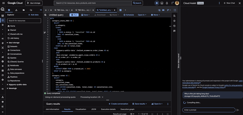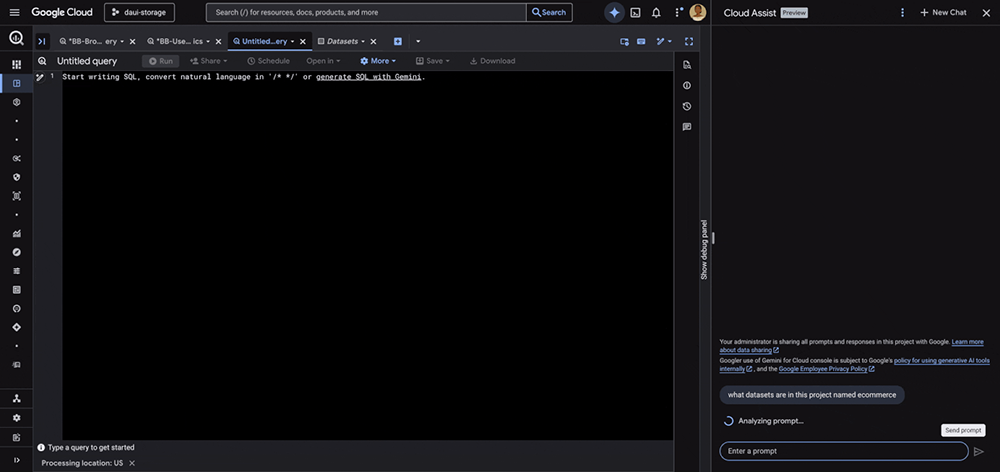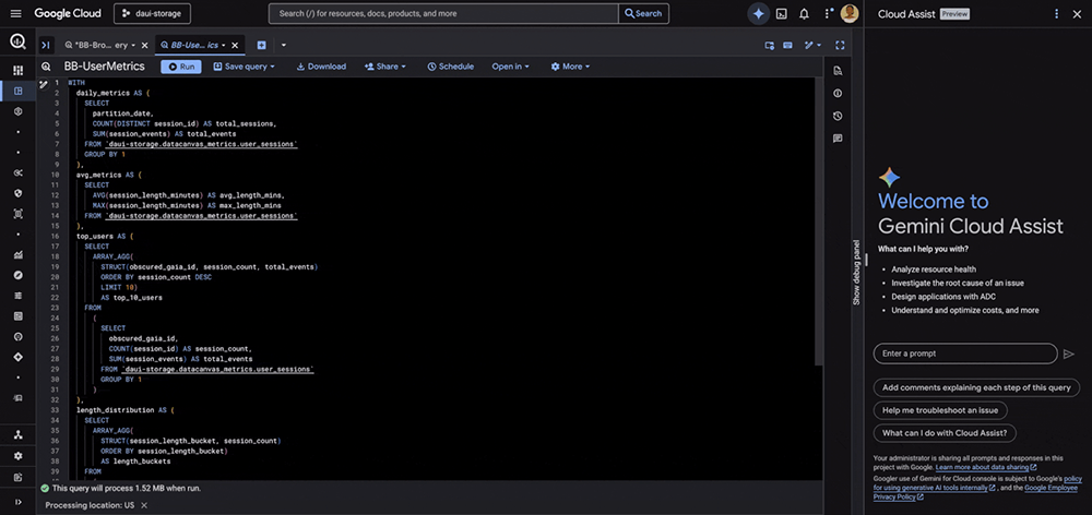 구글 클라우드 인사이트 BigQuery Studio의 Gemini 어시스턴트, 이렇게 달라졌습니다 구글 인사이트 by Miyeon. Jo 2026년 04월 02일 2026년 04월 02일 234 데이터 분석 업무를 하다 보면, 정작 “분석” 자체보다 그 주변 작업에 더 많은 시간을 쏟게 됩니다. 필요한 테이블이 어디 있는지 찾고, 스케줄링을 설정하고, 실패한 Job의 원인을 추적하는 일들이죠. BigQuery를 처음 접하는 분들이라면 이런 운영 오버헤드가 더욱 부담스럽게 느껴질 수 있습니다. Google Cloud의 BigQuery Studio에는 Gemini 기반 AI 어시스턴트가 내장되어 있습니다. 최근 업데이트를 통해 이 어시스턴트가 단순한 코드 보조 도구에서 컨텍스트를 이해하는 분석 파트너로 진화했습니다. 이번 글에서는 지금 바로 사용할 수 있는 세 가지 핵심 기능을 소개합니다. 1. 컨텍스트인식 — 열려 있는 쿼리 탭을 이해합니다 BigQuery Studio의 Gemini 어시스턴트는 현재 열려 있는 쿼리 에디터 탭의 내용을 인식합니다. 이전에는 쿼리 코드를 복사해서 채팅 창에 붙여넣거나, 어떤 테이블을 사용하고 있는지 일일이 설명해야 했습니다. 이제는 그럴 필요가 없습니다.어떻게 활용할 수 있나요? 활성화된 쿼리 탭에서 작업 중일 때, 채팅 창에 자연어로 질문하면 됩니다.예시 시나리오:– 쿼리 에디터에 SELECT문을 작성해 놓은 상태에서 → “이 쿼리를 최적화해줘” 라고 입력– 복잡한 JOIN 쿼리를 보고 있을 때 → “이 쿼리가 하는 일을 설명해줘” 라고 질문– 쿼리 결과를 보면서 → “이 결과를 주간 단위로 집계하는 쿼리로 바꿔줘” 라고 요청어시스턴트는 현재 활성 탭의 SQL 코드와 참조하는 리소스를 자동으로 파악하기 때문에, “쿼리”라고만 말해도 어떤 쿼리를 가리키는지 이해합니다.고급 SQL 생성:단순한 SELECT문 외에도, 어시스턴트는 AI 연산자(AI Operators) 와 Federated Query를 활용하는 고급 SQL도 생성할 수 있습니다. 자연어 프롬프트만으로 복잡한 분석 쿼리를 만들어낼 수 있다는 뜻입니다. Fig 1.1 — 어시스턴트가 활성 탭과 “쿼리”가 무엇을 가리키는지 인식하는 모습 2. 리소스 검색 — 테이블 이름을 몰라도 괜찮습니다 조직이 커질수록 데이터는 여러 프로젝트와 데이터셋에 흩어집니다. 정확한 테이블 ID를 기억하기 어려운 건 당연한 일입니다.Gemini 어시스턴트는 이제 Dataplex Universal Catalog 검색 기능과 연동되어, 여러 프로젝트에 걸쳐 BigQuery 리소스를 찾을 수 있습니다. 데이터셋, 테이블, 모델, 저장된 쿼리, 그리고 예약 쿼리(Scheduled Query)까지 검색 대상에 포함됩니다.자연어로 데이터를 찾는 방법:일상적인 언어로 질문하면 됩니다.– “신규 사용자의 나이, 지역 같은 인구통계 데이터는 어디서 찾을 수 있어?”> 관련 테이블을 프로젝트 전체에서 검색하여 목록으로 보여줍니다– “ecommerce라는 이름의 데이터셋이 있나?> 해당 이름의 데이터셋을 찾아 위치와 함께 알려줍니다이– “테이블은 파티셔닝이 되어 있어?”> 파티션 구성, 클러스터링 키 등의 메타데이터를 확인해줍니다– “이 데이터셋의 소유자가 누구야?”> 소유자 정보를 반환하여 접근 권한 요청에 도움을 줍니다 Fig 1.2 — 어시스턴트가 여러 프로젝트에서 사용자 프롬프트에 맞는 데이터셋을 찾는 모습 3. Job 분석 및 트러블슈팅 — 문제의 원인을 바로 파악합니다 평소 몇 초면 끝나던 쿼리가 갑자기 오래 걸리거나, 예상보다 높은 비용이 청구될 때가 있습니다. 이전에는 INFORMATION_SCHEMA를 직접 조회하거나 로그를 뒤져야 했습니다.이제 Gemini 어시스턴트가 개인 및 프로젝트 Job 히스토리를 분석하여 인사이트를 제공합니다.주요 활용 사례:– 장시간 실행 쿼리 디버깅:> Job ID를 복사하고 “이 Job이 왜 이렇게 오래 걸려?” 라고 질문하면, 어시스턴트가 Job 상태를 분석합니다. 슬롯 경합(slot contention), 대량 행 스캔, 높은 데이터 볼륨 등 지연의 원인이 되는 핵심 통계를 반환합니다.– 실패한 Job의 근본 원인 분석:> 예약 쿼리가 실패했을 때, “이 예약 Job이 왜 실패했어?” 라고 물으면 실패 원인을 분석하고 해결 방법까지 추천합니다.– 비용 관리:> “최근 2일간 가장 비용이 많이 든 쿼리 3개를 알려줘” 같은 요청을 하면, 어시스턴트가 INFORMATION_SCHEMA를 조회하는 데 필요한 SQL을 직접 생성해줍니다. Fig 1.3 — 어시스턴트가 Job을 분석하고 최적화 방안을 제시하는 모습 BigQuery Studio의 Gemini 어시스턴트는 코드 보조 도구를 넘어, 데이터 분석의 전체 라이프사이클을 지원하는 파트너로 진화하고 있습니다. 리소스 검색을 간소화하고, SQL 워크플로를 자동화하며, 트러블슈팅을 효율화함으로써 데이터 엔지니어와 분석가가 운영 관리가 아닌 고부가가치 인사이트 도출에 집중할 수 있도록 돕습니다.BigQuery를 처음 시작하는 분이라면, Gemini 어시스턴트를 적극 활용해 보세요. 자연어로 대화하면서 BigQuery의 기능을 자연스럽게 익힐 수 있는 좋은 학습 도구이기도 합니다. 출처 https://cloud.google.com/blog/products/data-analytics/gemini-supercharges-the-bigquery-studio-assistant?hl=en / https://docs.cloud.google.com/bigquery/docs/bigquery-web-ui?hl=ko https://cloud.google.com/blog/ko/products/data-analytics/announcing-bigquery-studio