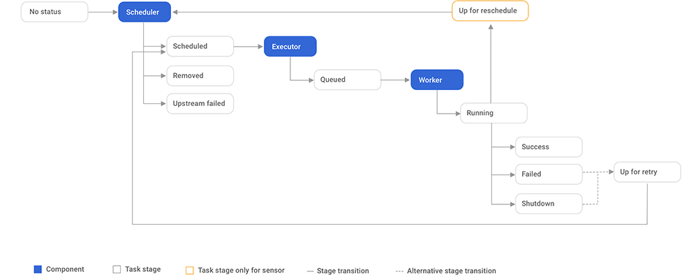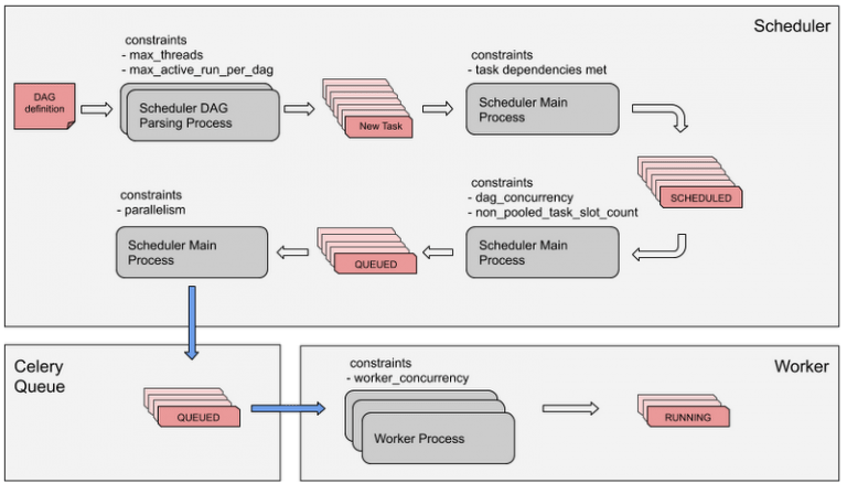 구글 클라우드 인사이트 Cloud Composer 아키텍처 살펴보기 구글 인사이트 by Miyeon. Jo 2021년 07월 05일 2021년 07월 05일 445 구글 PS1팀 박성진목차데이터 파이프라인Apache Airflow 아키텍처Cloud Composer 아키텍처요약1. 데이터 파이프라인데이터 파이프라인은 일련의 데이터 처리 단계입니다. 데이터가 현재 데이터 플랫폼에 로드되지 않은 경우 파이프라인 시작 부분에서 수집됩니다. 그런 다음 각 스텝이 다음 스텝으로 입력되는 출력을 제공하는 일련의 스텝이 있습니다. 이 작업은 파이프라인이 완료될 때까지 계속됩니다. 경우에 따라 독립 단계를 병렬로 실행할 수 있습니다.아래는 간단한 파이프라인의 그림입니다.각 단계에서 실행되는 작업은 파일 생성 유무를 확인하는 센싱 작업일 수도 있고, 파일을 업로드 하는 작업일 수도 있으며, 파일을 라인별로 읽어서 변환하는 작업일 수도 있고, 여러 개의 파일을 하나로 싱크 하거나 데이터베이스에 적재하는 작업일 수도 있습니다. 또한 이런 작업들이 상호간의 의존성을 가질 수도 있으며, 동시에 진행이 될 수도 있습니다. 파이프라인은 이런 일련의 작업들을 정해진 시간에 규칙적으로 반복할 수도 있을 뿐더러, 동시에 여러 개의 파이프라인을 작동할 수도 있습니다. 이런 작업의 흐름을 관리하는 도구를 Workflow Management Platform(WfMP) 이라고 합니다.WfMP를 구현한 소프트웨어는 아주 많지만 Apache Airflow는 유명한 오픈소스 중 하나이며, Google Cloud Platform에서는 Apache Airflow의 Managed Service인 Cloud Composer를 제공하고 있습니다.따라서 Cloud Composer를 활용해 데이터 파이프라인을 구축하기 위해서는 Apache Airflow를 먼저 이해해야 합니다.2. Apache Airflow 아키텍처아래는 Apache Airflow의 아키텍처를 간단히 표현한 그림입니다.Airflow는 간단한 Web UI를 제공해 사용자로 하여금 파이프라인 운영을 원활하게 하는데 도움을 주고 있지만, 아키텍처 구조상 SPoF가 발생할 수 있으므로 파이프라인 구축 시에 신중해야 합니다.컴포넌트 별로 하나씩 살펴보겠습니다.User Interface User Interface는 사용자의 웹 환경 혹은 터미널의 CLI가 될 수 있습니다.Webserver 사용자 요청을 처리하기 위한 웹서버입니다.Scheduler DAG Directory에 존재하는 Python 파일을 파싱하여, DAG를 추출해 Task Graph를 그리고 정해진 시간에 DAG를 실행을 위한 일련의 절차를 진행합니다.Executor Executor는 Worker에게 Task를 전달하는 전달자 역할을 하며, 어떤 종류의 Executor를 사용하느냐에 따라 Task 전달하는 방법이 순차 혹은 병렬로 결정이 됩니다.Workers Workers는 실제 Task를 수행하는 주체로써 동시에 많은 Task를 실행할 수 있게 다수가 존재합니다.Metadata Database Scheduler가 파싱한 DAG와 Task 인스턴스 정보, Worker가 실행하면서 발생한 이력들이 airflow_db 라는 이름으로 존재합니다.Airflow는 User Interface와 Worker를 제외하면 각 컴포넌트는 기본적으로 단일 구성입니다. Worker 컴포넌트만 동시성을 위해 분산 구조로 만들어져 있으며 그 외는 HA 구성이 되어있지 않습니다. 따라서 하나의 컴포넌트라도 장애가 발생하면 Airflow는 정상 작동하지 않습니다.아래는 Airflow의 Task 인스턴스의 Lifecycle 입니다.Airflow를 사용하는 데이터 엔지니어라면 Task 인스턴스 위 그림은 반드시 숙지해야할 항목입니다. 운영 환경에서 장애가 발생 했거나 성능 향상을 고려할 경우 어느 컴포넌트에 집중해야할지 빠르게 파악할 필요가 있기 때문입니다.아래 그림은 Task 인스턴스 Lifecycle 구간 마다 사용되는 Airflow 환경 변수 입니다.지금까지 알아본 Airflow 컴포넌트와 환경 변수들에 대한 이해가 충분하더라도 Airflow를 운영하기에는 아직 부족함이 있습니다.하드웨어 이슈로 인해 Airflow의 마이그레이션을 해야하거나, Airflow 버전 업그레이드를 해야하는 경우, 단일 구성 컴포넌트가 장애가 발생하는 경우에는 인프라 담당자, 시스템 엔지니어, 데이터 엔지니어가 모두 하나의 마음으로 고난과 역경을 이겨내야 합니다.3. Cloud Composer 아키텍처데이터 엔지니어가 파이프라인에 집중하기 위해서는 인프라 업무와 시스템 업무에서 분리되는 것이 가장 좋습니다. 이런 환경을 제공해주는 것이 Google Cloud의 Cloud Composer 입니다.아래는 Cloud Composer 아키텍처를 요약한 그림입니다.실제 업무 환경에 따라 Cloud Composer 환경은 공개 IP, 비공개 IP, 도메인 제한 공유(DRS)의 세 가지 구성으로 만들 수 있습니다. 각 구성은 프로젝트 리소스의 아키텍처를 약간 다르며 이 문서에서는 도메인 제한 공유(DSR) 구성은 설명하지 않습니다.아래는 Cloud Composer 공개 IP 아키텍처입니다.공개 IP 구성에서 환경 리소스는 고객과 테넌트 프로젝트 간에 배포됩니다. 테넌트 프로젝트는 Airflow 데이터베이스를 실행하기 위한 Cloud SQL 인스턴스와 Google App Engine Flex VM을 호스팅하여 Airflow 웹 서버를 실행합니다.아래 그림과 같이 Airflow 스케줄러, 작업자, 웹 서버는 Cloud SQL 프록시 프로세스를 사용하여 Airflow 데이터베이스에 연결합니다.아래는 Cloud Composer 비공개 IP 아키텍처입니다.비공개 IP 구성에서 Cloud Composer 리소스는 고객과 테넌트 프로젝트 간에 배포됩니다. 테넌트 프로젝트는 Airflow 데이터베이스를 실행하기 위한 Cloud SQL 인스턴스